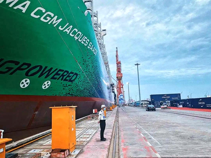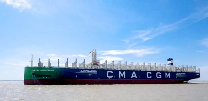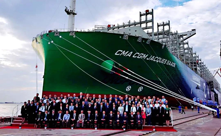 9月22日,中國船舶集團(tuán)有限公司旗下滬東中華造船(集團(tuán))有限公司和中國船舶工業(yè)貿(mào)易有限公司作為聯(lián)合賣方,為世界著名航運(yùn)公司——法國達(dá)飛集團(tuán)建造的世界首艘23000TEU雙燃料動(dòng)力集裝箱船“達(dá)飛雅克·薩德”號,在上海長興島造船基地命名交付。