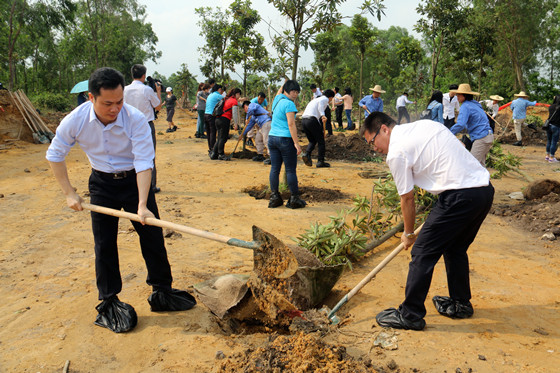 由于連日多雨天氣,植樹(shù)現(xiàn)場(chǎng)土地泥濘,但絲毫不影響集團(tuán)員工的勞動(dòng)熱情。大家扶苗、揮鏟、培土,現(xiàn)場(chǎng)一派熱火朝天的景象。短短一個(gè)小時(shí),數(shù)十棵樹(shù)苗迎風(fēng)挺立,扎根在這曾為茂名工業(yè)發(fā)展做出巨大貢獻(xiàn)的土地上,把露天礦生態(tài)公園裝點(diǎn)得更加生機(jī)盎然。