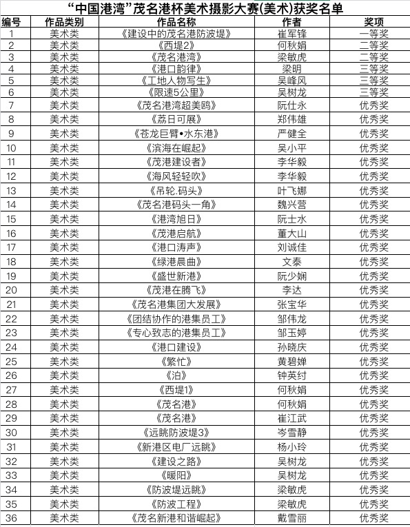 附件: 《第一屆“中國港灣”茂名港杯美術(shù)攝影大賽(美術(shù)類)獲獎(jiǎng)名單》 第一屆“中國港灣”茂名港杯美術(shù)攝影大賽(美術(shù)類)獲獎(jiǎng)名單.xlsx